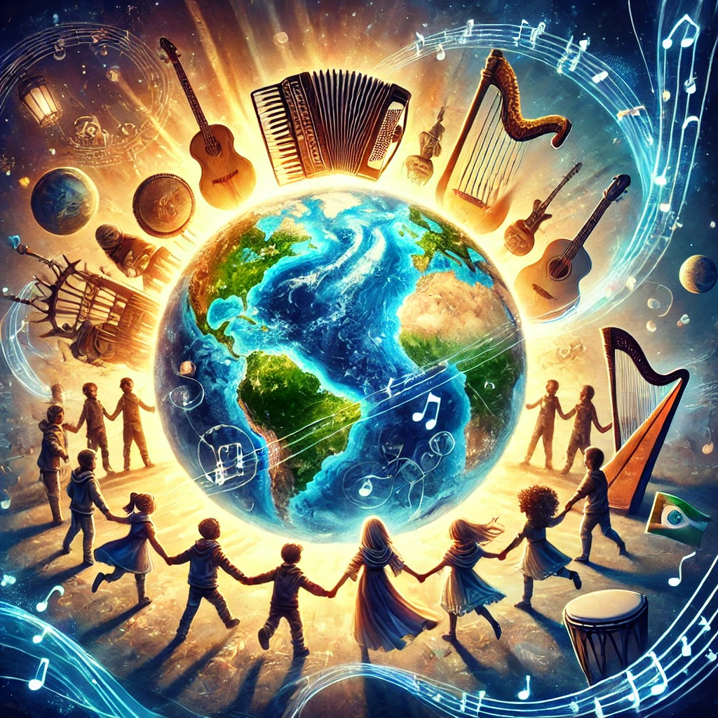 🪗 Include accordion, 🎵 harmonica, 🎼 Celtic harp, 🥁 African drums floating around the planet, with light beams and music notes weaving between them.